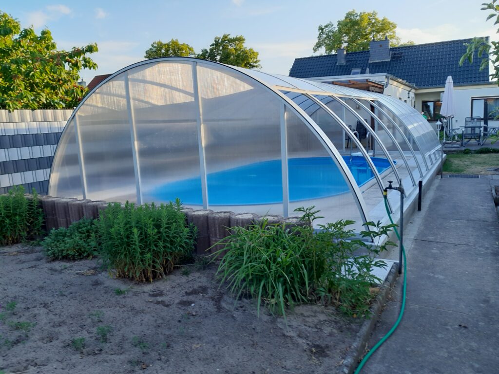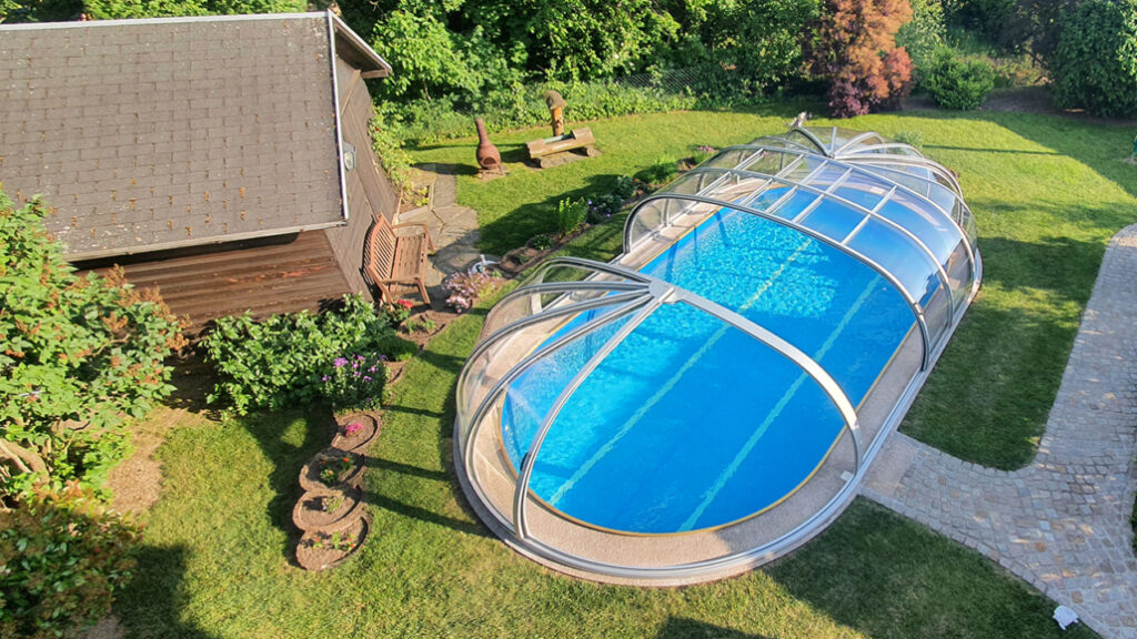 Die hohe Poolüberdachung verwandelt Ihren Pool in ein ganzjährig nutzbares Hallenbad. Mit voller Stehhöhe können Sie sich frei bewegen, Liegemöbel aufstellen und Ihren Poolbereich wie einen Wintergarten nutzen, bei jedem Wetter.
